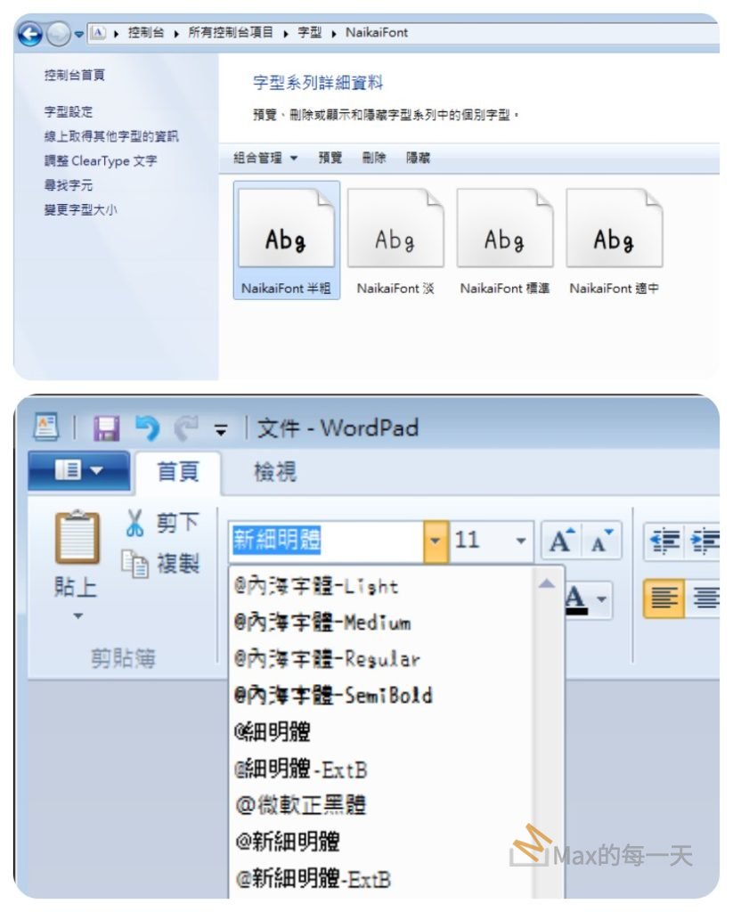 套用上面的設定值後,在Windows 裡字體就可以正常顯示,而且也有自己的字體家族:
