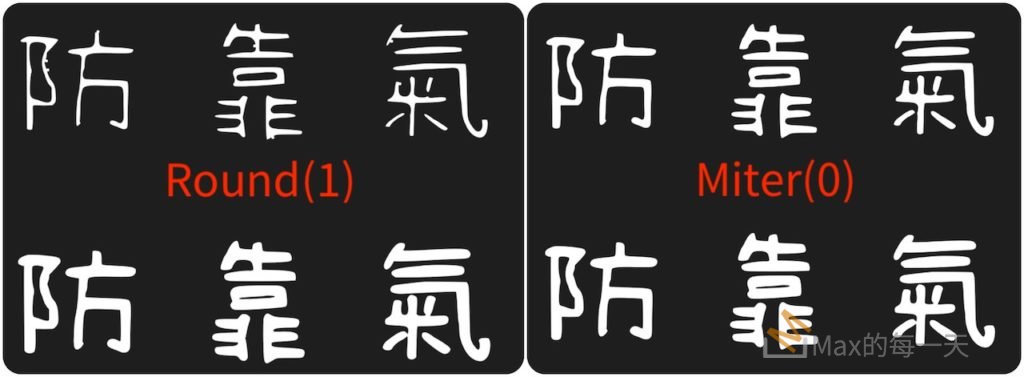 miter 的容錯力似乎比 round 好,在幫清松手寫體3變細時,使用 round 容易出現奇怪的肉瘤,改用 miter 就沒有這個問題: