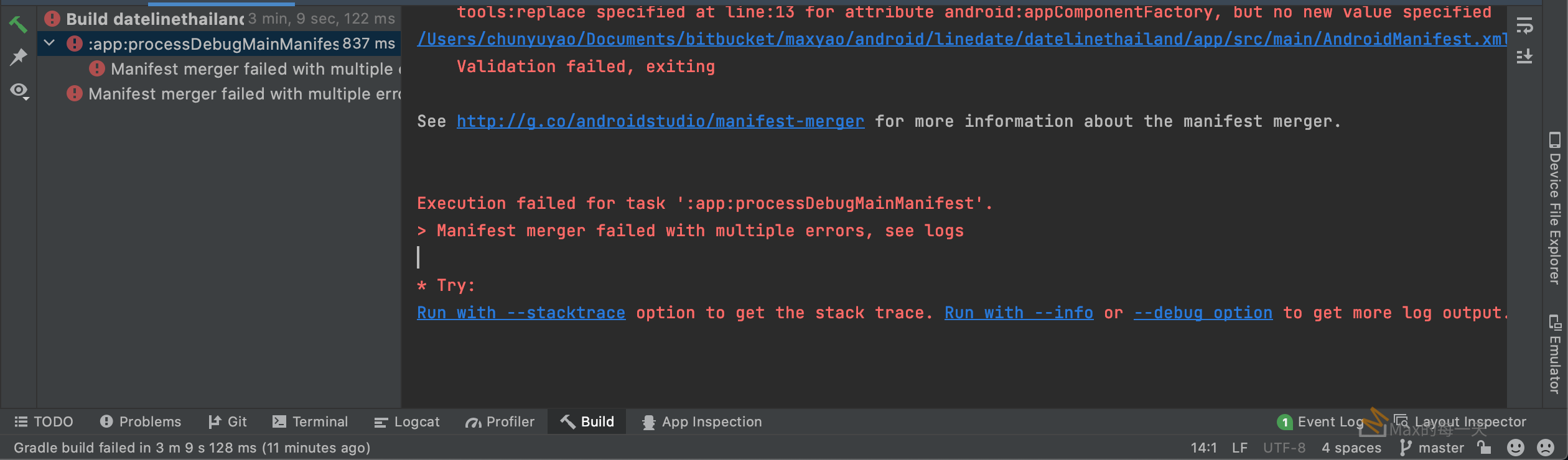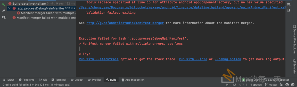Execution failed for task ':app:processDebugMainManifest'. > Manifest merger failed with multiple errors, see logs * Try: Run with --stacktrace option to get the stack trace. Run with --info or --debug option to get more log output. Run with --scan to get full insights.