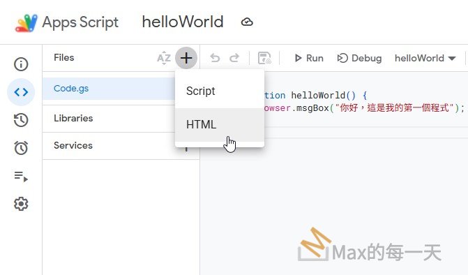 要在 GAS 執行 HTML 網頁。必須使用名為 doGet 的特殊函式。這是 Google 定義的標準接口。它會告訴伺服器你要回傳一個 HTML 檔案。增加 script 到 Code.gs