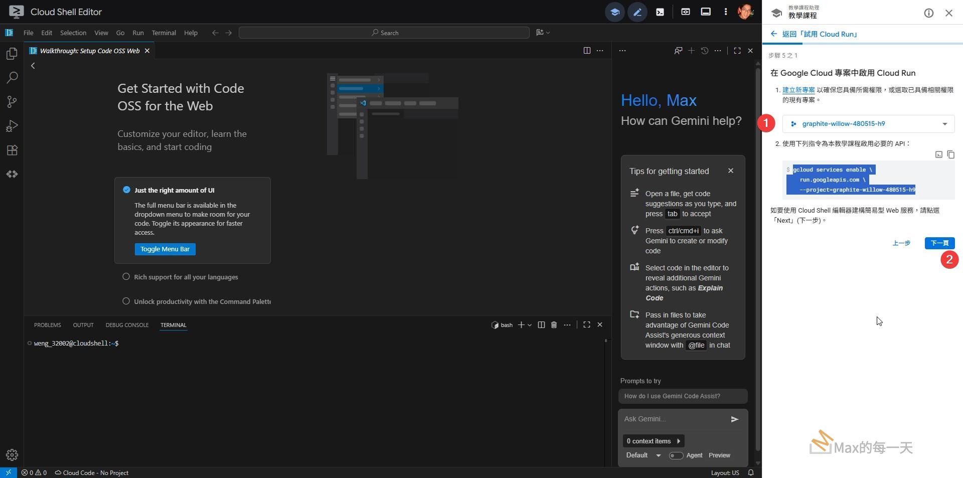 如要開始使用,請按照 Cloud Shell 編輯器中的逐步操作說明進行。