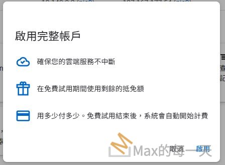 - 啟用完整帳戶: 這是一個手動的動作。一旦啟用,您的帳戶就會變成「即付即用」狀態。您會先使用剩餘的免費試用抵免額,抵免額用完或過期後,GCP 就會開始透過您登錄的付款方式收費。