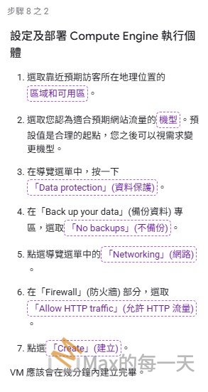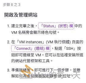 GCP 做的 在 Compute Engine 上部署網站 的教學課程做的滿好的, 淺顯易懂, 在最右側點對應的超連結, 左側就會移到的相關區塊, 如果左側的網頁不對, 也會彈出對應的訊息, 要求使用者去那一個頁面, GCP 的系統生態很大, 也很複雜, 不過還好, 就像看到百科全書, 不需要一頁一頁去讀, 讀有需要使用到的頁面即可.
