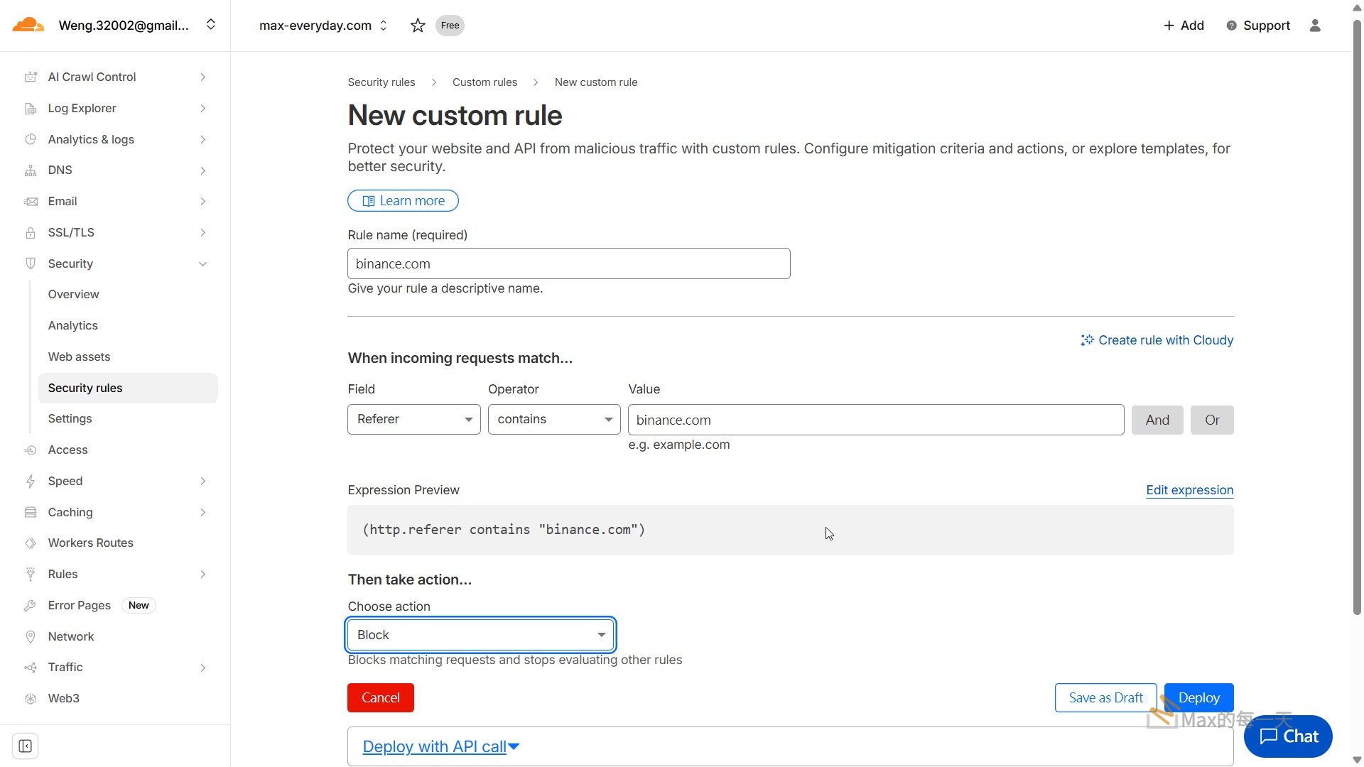 - 進入 Security (安全性) -> WAF -> Create rule (建立規則)。