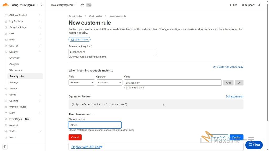 - 進入 Security (安全性) -> WAF -> Create rule (建立規則)。