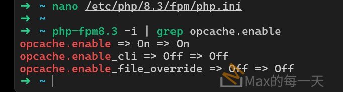 如果你想確認目前 OPcache 是否真的有在運作,可以撰寫一個包含 phpinfo(); 內容的檔案並透過瀏覽器執行,或者在終端機輸入 php-fpm8.3 -i | grep opcache.enable 來查看最終生效的數值。