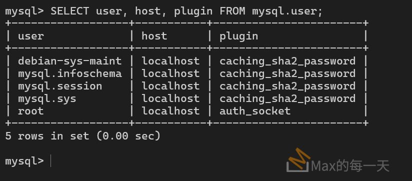 - 如果 plugin 顯示為 auth_socket,代表該帳號是透過 Linux 系統權限登入,不需要在 MySQL 輸入密碼。