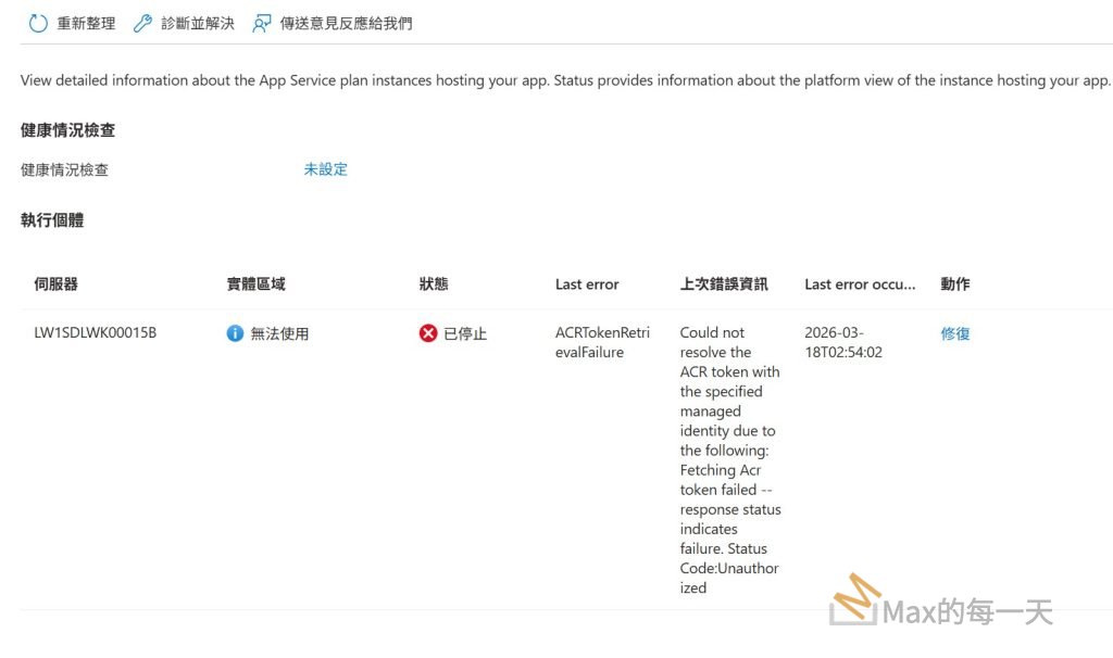 這個錯誤 ACRTokenRetrievalFailure 代表你的 Azure 資源(例如 App Service、AKS 或 Container App)雖然嘗試使用受控識別 (Managed Identity) 來登入,但被 Azure Container Registry (ACR) 拒絕了(401 Unauthorized)。