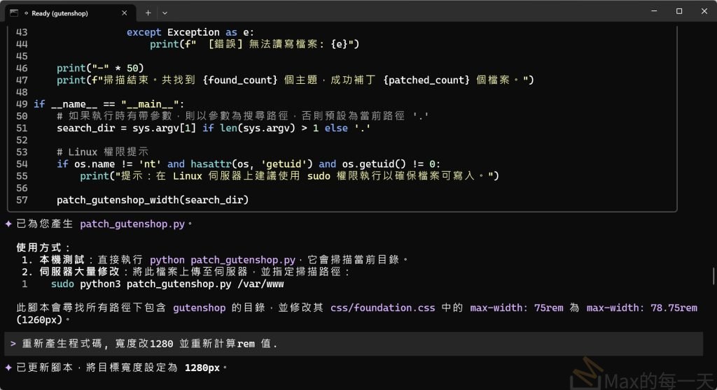 ✦ 我現在就在當前目錄為您產生 patch_gutenshop.py 實體檔案