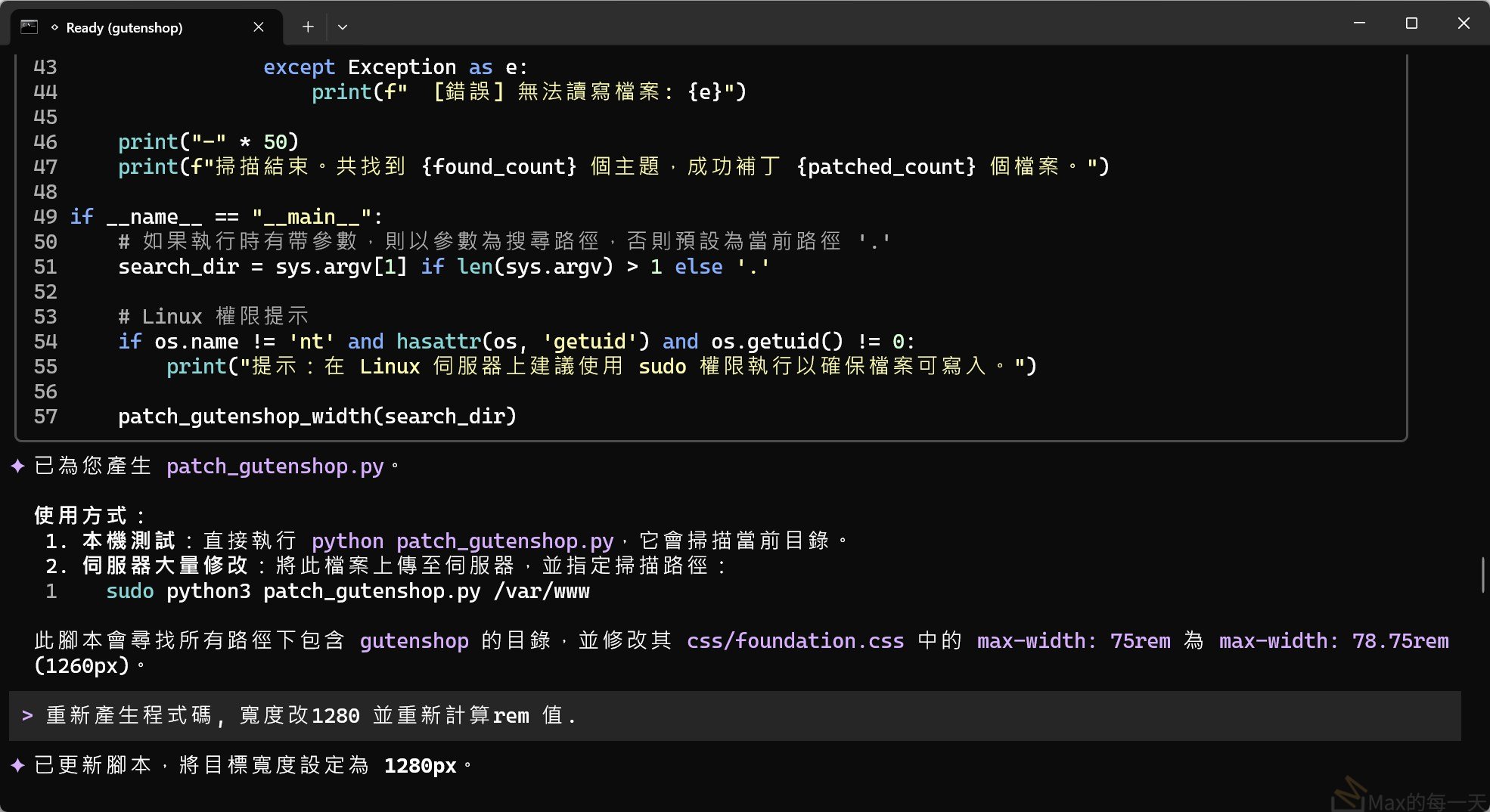 此腳本會尋找所有路徑下包含 gutenshop 的目錄,並修改其 css/foundation.css 中的 max-width: 75rem 為 max-width: 80rem (1280px)。