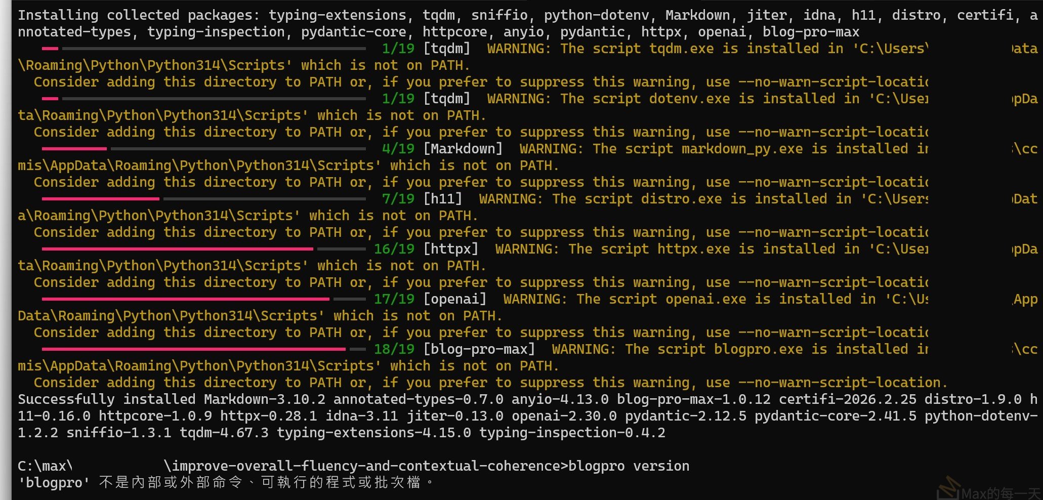 根本原因補充:你這次安裝其實成功了,只是 PATH 問題。Python 3.14 是 pre-release,依賴套件(尤其是 ddgs)可能尚未支援,這才是真正的風險點。現在 ddgs 已改為 optional,不會再造成硬性安裝失敗。