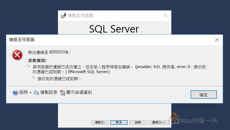 雖然您的電腦可以連線到 SQL Server,但伺服器使用的 SSL/TLS 憑證已經過期。