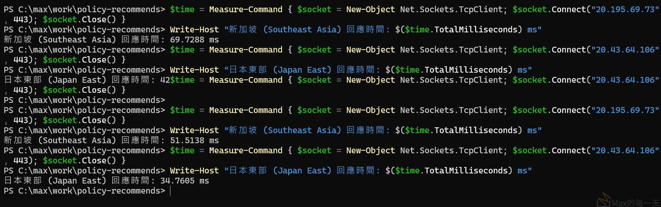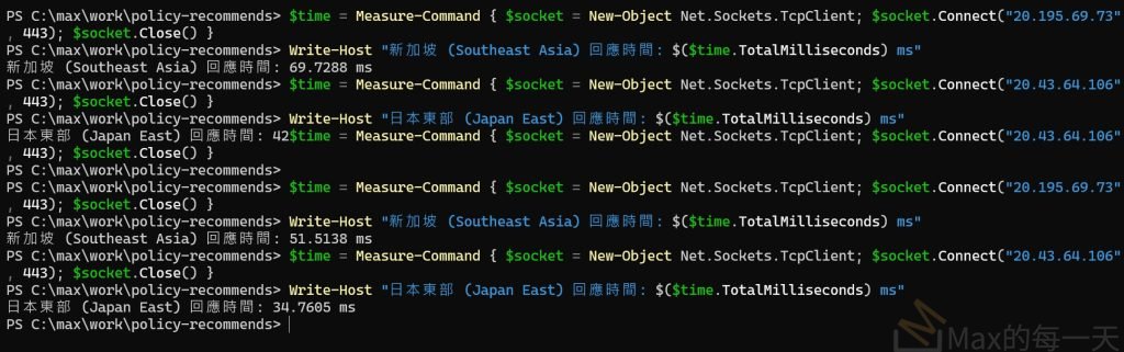 Write-Host "新加坡 (Southeast Asia) 回應時間: $($time.TotalMilliseconds) ms"