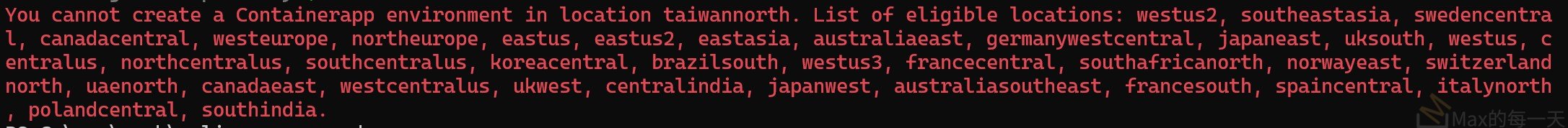 這會直接噴出目前全球支援 Container App Environment 的所有清單,你可以看到 taiwannorth 是否在裡面。