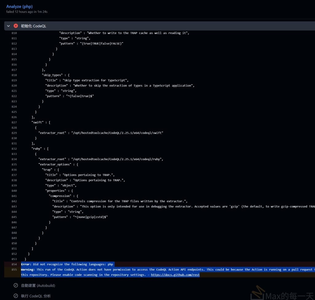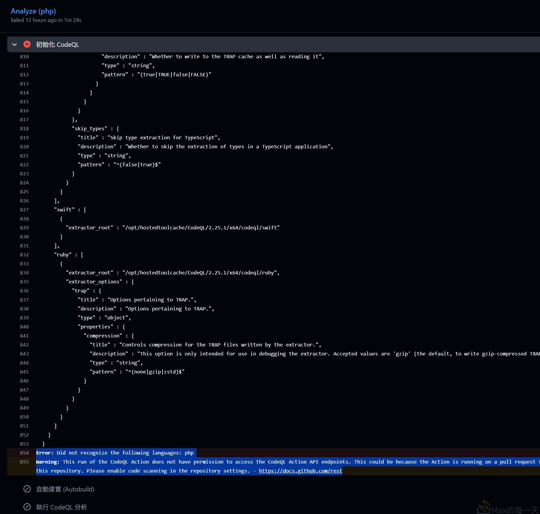 當 CodeQL 因為權限不足無法從 GitHub API 獲取配置或下載必要的語言組件時,它可能會退回到一個「空狀態」,然後報錯說它「不認識 php」。
