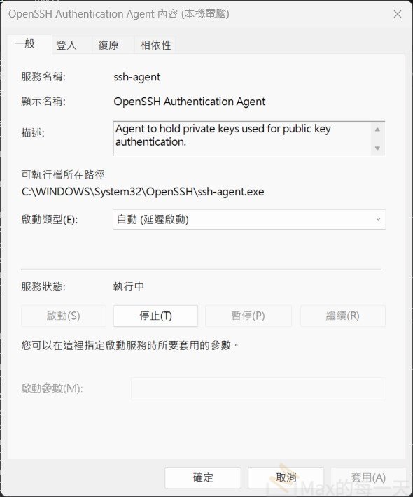 以管理員身分開啟 PowerShell,執行以下指令將 OpenSSH Authentication Agent 服務設定為自動啟動