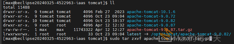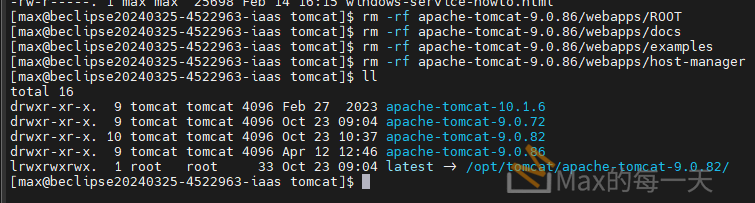 上圖可以看的出來, 搬進去 /opt/tomcat 的帳號是 max, 解壓縮後目錄的擁有者的是 root