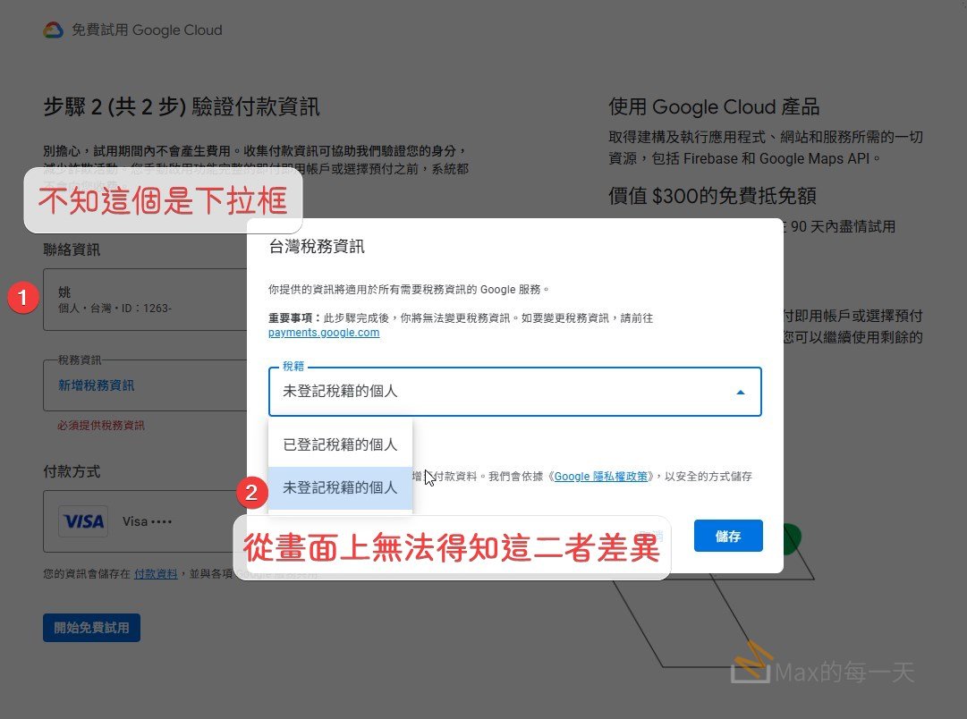 如果您是在台灣以個人名義註冊並使用GCP,沒有營業登記,就選「未登記稅籍的個人」;